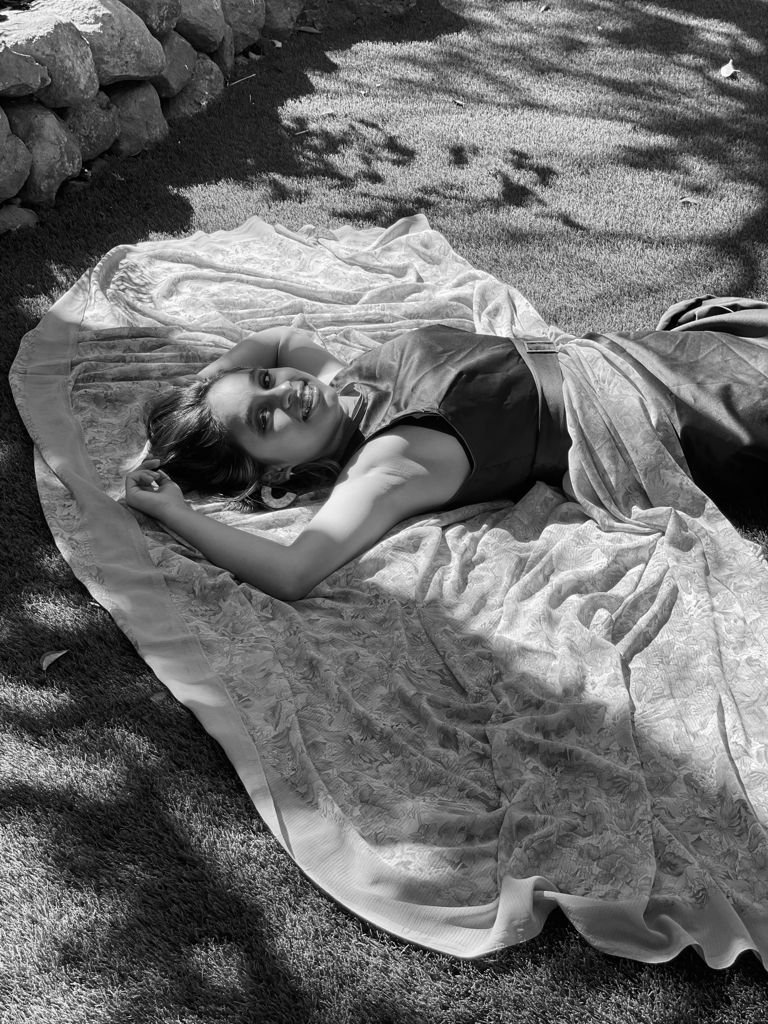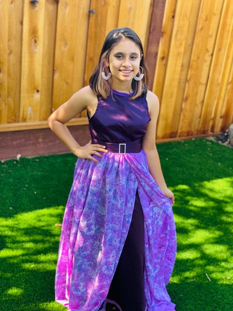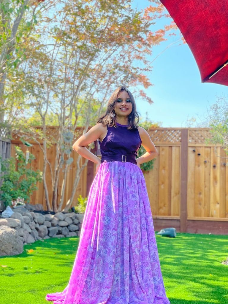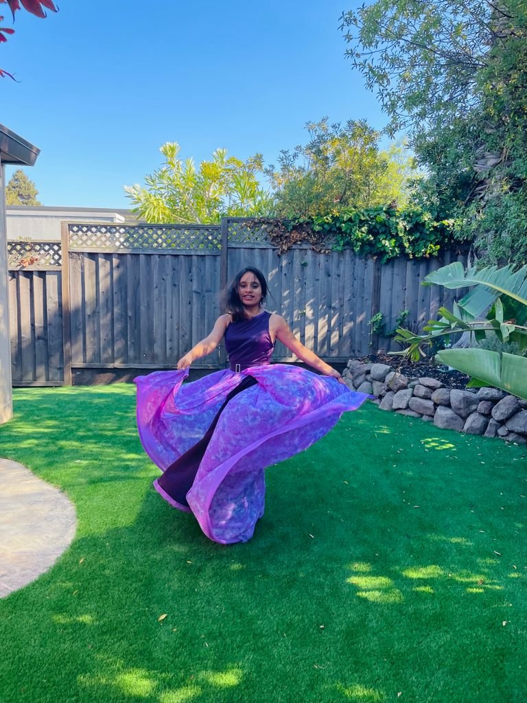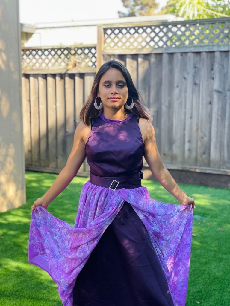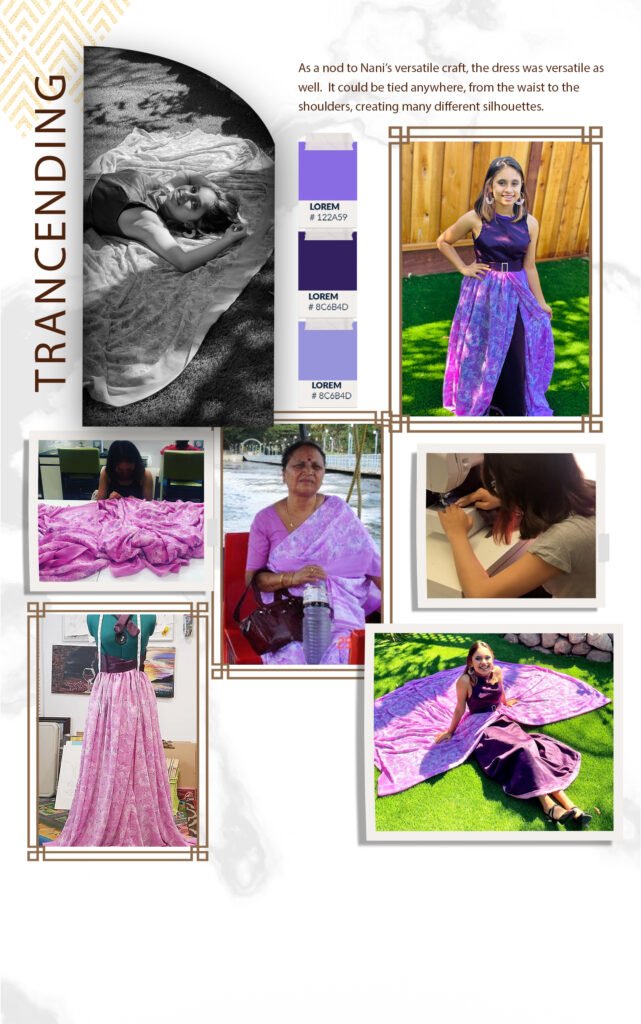 It was eye-opening to transform the fabric from one style to another and essentially pass it from one generation to another. The fabric had a distinct smell, a smell that reminded me of my Nani and my grandparent’s home in Dehradun. I remember her warm smile, gentle laugh, and beautiful aura by simply smelling that fabric. It is just a reminder that the saari, though it is nonliving, lived through my grandmother’s life and now it will live through mine; and this applies to any item of clothing. By using that purple flower-patterned fabric, I feel as if I am honoring her by honing her dressmaking skills and continuing her legacy.