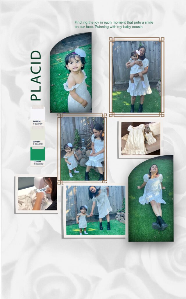 A charming twin collection featuring myself and my little cousin, centered around an elegant off-white shift dress. This project reflects her attention to detail, playful creativity, and love for designing pieces that celebrate personal connection and shared moments. Through this collection, she demonstrates how fashion can be both stylish and sentimental, turning everyday wear into memorable experiences.